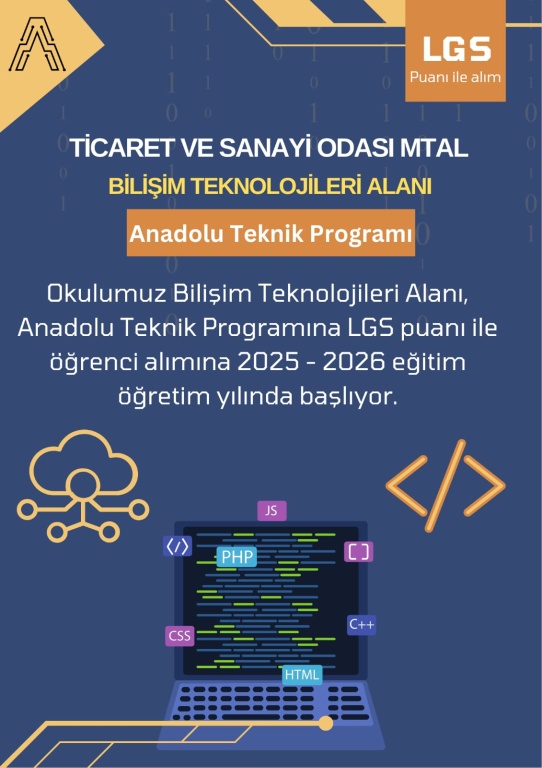 Okulumuzda 2025–2026 eğitim-öğretim yılı için Bilişim Teknolojileri Alanı, Anadolu Teknik Programı kapsamında LGS puanı ile öğrenci alımı yapılacaktır.