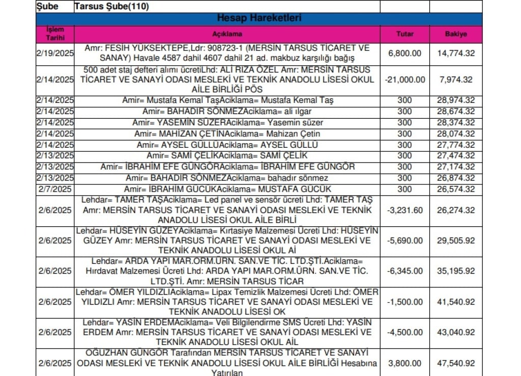 OKUL AİLE BİRLİĞİ GELİR-GİDER CETVELİ